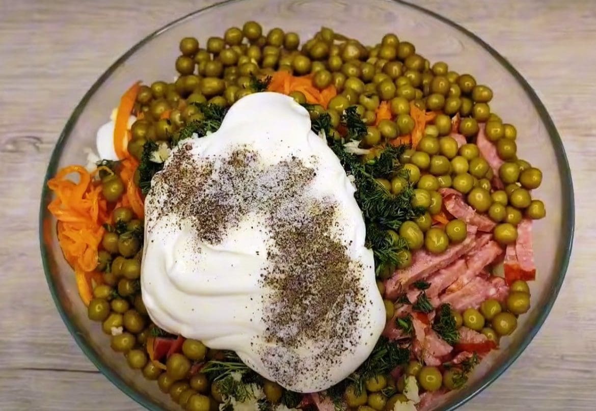 Į didelę salotų dubenį sudėkite kopūstus, agurkus, dešrą, kiaušinius, morkas ir žaliuosius žirnelius. Jei norite, galite pridėti šviežių krapų arba kitų mėgstamų žolelių.