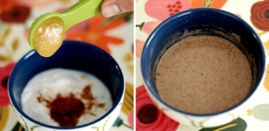 Sumaišykite ingredientus: į dubenėlį sudėkite kepimo sodą, medų, vitaminą E, cinamoną ir pieną arba grietinėlę. Gerai išmaišykite, kol gausite vienalytę masę. Mišinys turėtų būti gana tirštas, tačiau pakankamai skystas, kad jį būtų patogu užtepti ant odos.