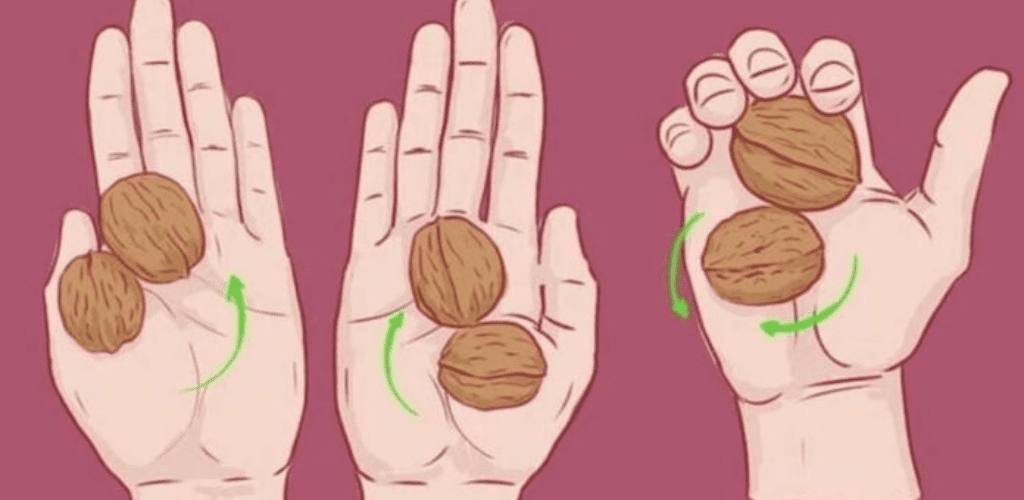 Paimkite du graikinius riešutus ir įsidėkite po kiekvienu delnu. Sukite riešutus ratu, švelniai paspausdami ir masažuodami delnus. Šis veiksmas stimuliuoja akupresūros taškus, kurie yra susiję su plaučiais, širdimi ir kitais svarbiais organais, atsakingais už emocinį stabilumą ir kvėpavimą.