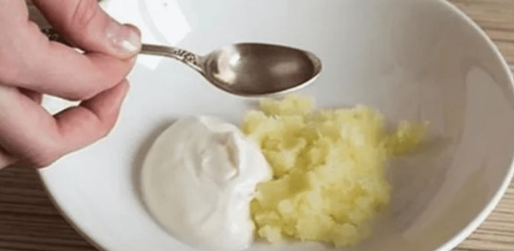 - 1/2 arbatinio šaukštelio grietinės arba jogurto arba augalinio aliejaus – drėkinamieji ir maitinamieji ingredientai, kurie suteikia odai elastingumo ir švelnumo.
