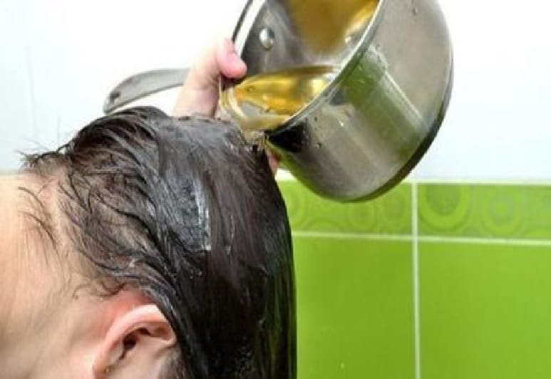 - Šiuo tirpalu skalaukite plaukus po plovimo 15–20 minučių.