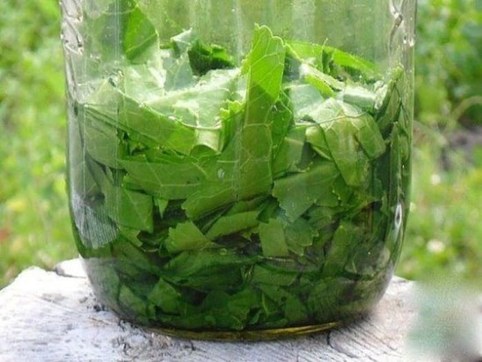 Užpylimas: Užpilkite lapus gera degtine arba praskiestu spiritu (apie 40–50 laipsnių), kad skystis visiškai apsemtų žalumynus.