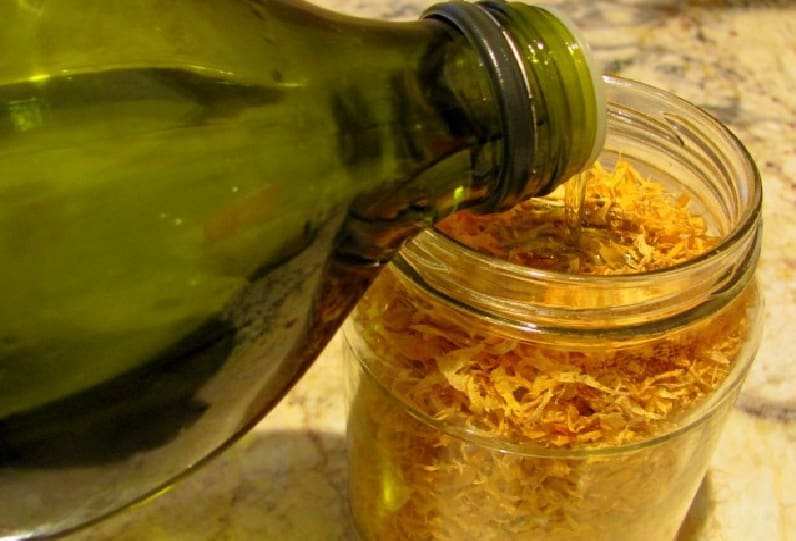 Užpilkite aliejų: įdėkite 1 arbatinį šaukštelį šviežių medetkų žiedų į indą ir užpilkite alyvuogių arba kitokiu augaliniu aliejumi, kad žiedai apsemtų ir būtų visiškai padengti.