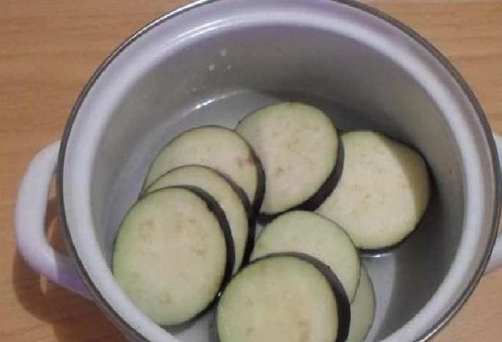 Sudėkite supjaustytą baklažaną į puodą su vandeniu ir užvirinkite ant vidutinės ugnies.