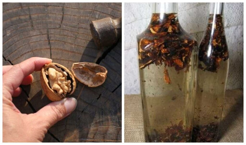 Į 1 litrą degtinės įberkite 2 šaukštus riešutų plėvelių, įdėkite kelias džiovintas slyvas ir šiek tiek medaus ar cukraus.