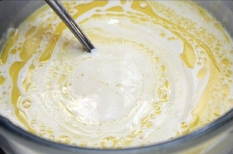 - Atskirai išplakite trynį ir įmaišykite į mišinį.