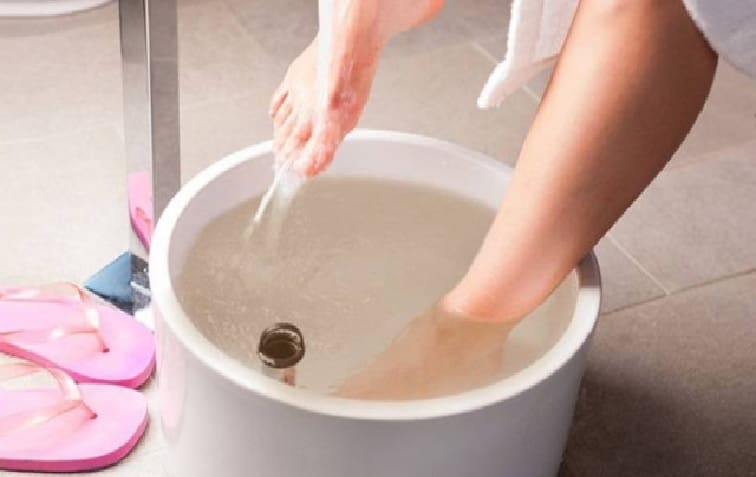 Mirkimas: įmerkite kojas į tirpalą ir laikykite apie 15 minučių. Svarbu stebėti temperatūrą ir laikytis laiko – ilgiau mirkimas gali sukelti priešingą efektą ir odos sudirginimą.