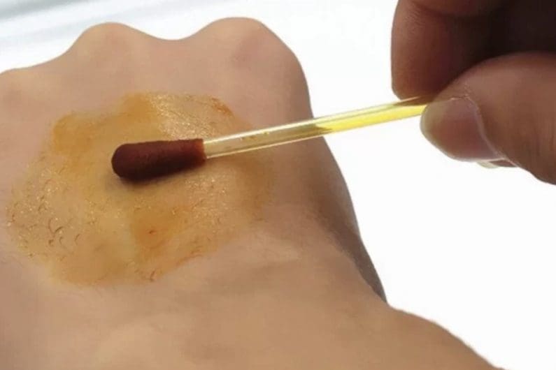 Jodo dėmės uždėjimas: pamirkykite vatos tamponėlį jodo tinktūroje ir užtepkite ant odos, dažniausiai ant riešo ar kirkšnies srities.
