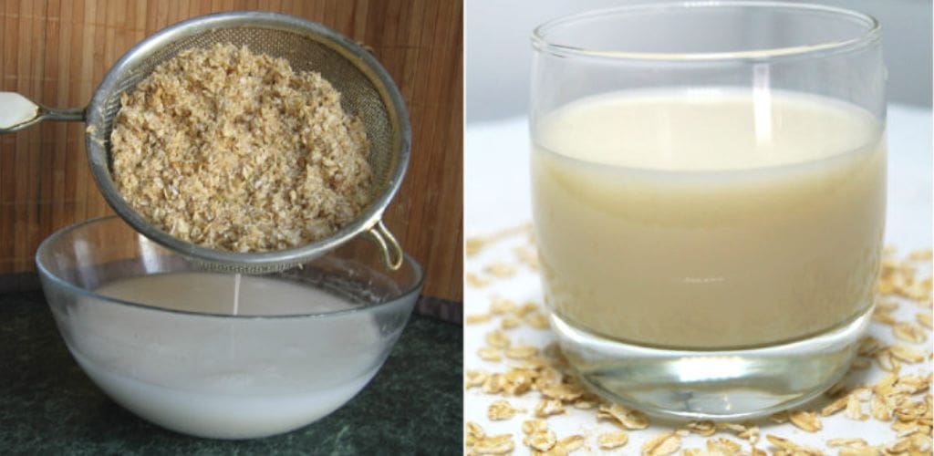 Po tam tikro laiko, išmaišykite ir nukoškite skystį per sietelį ar marlę. Gautas skystis – tai avižinių dribsnių vanduo.