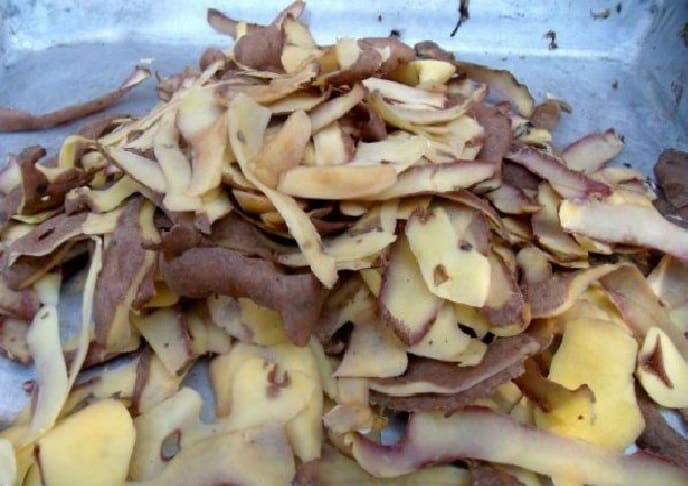 - Supilkite į jį bulvių lupenas.