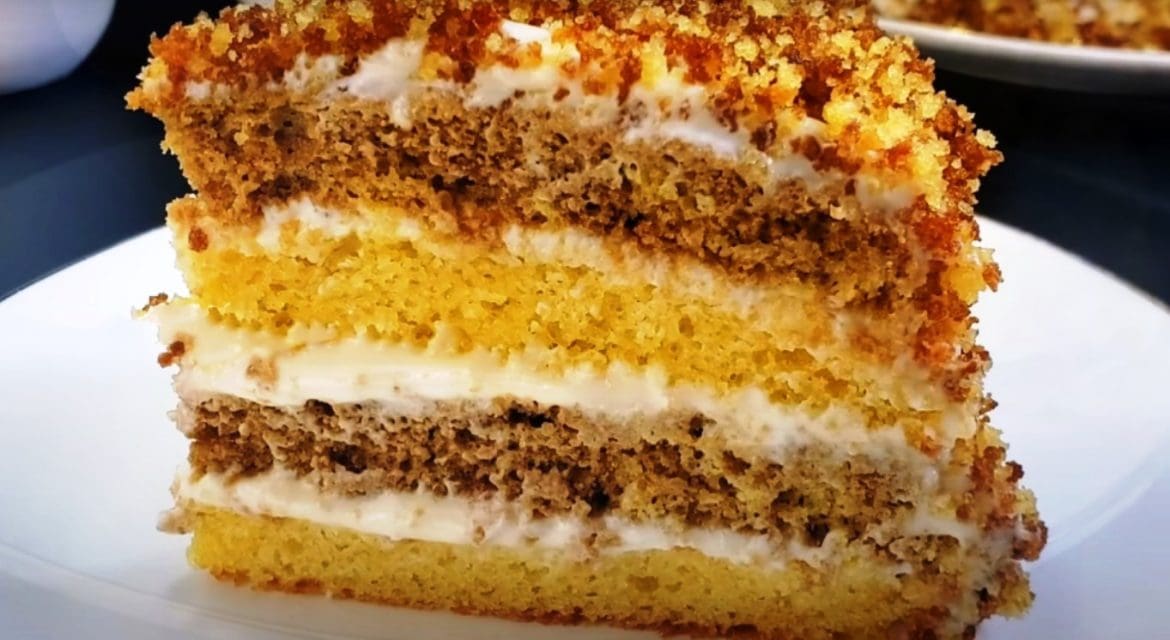 Supilkite tešlą į kepimo formą, išklotą kepimo popieriumi. Kepkite 180 °C temperatūroje apie 20 minučių. Po kepimo leiskite pyragui atvėsti ir nuimkite viršutinę plokštelę, jei ji yra, ir padalinkite į 2 sluoksnius. Taip gausite 4 sluoksnius, kurie bus pasiruošę pyrago surinkimui.