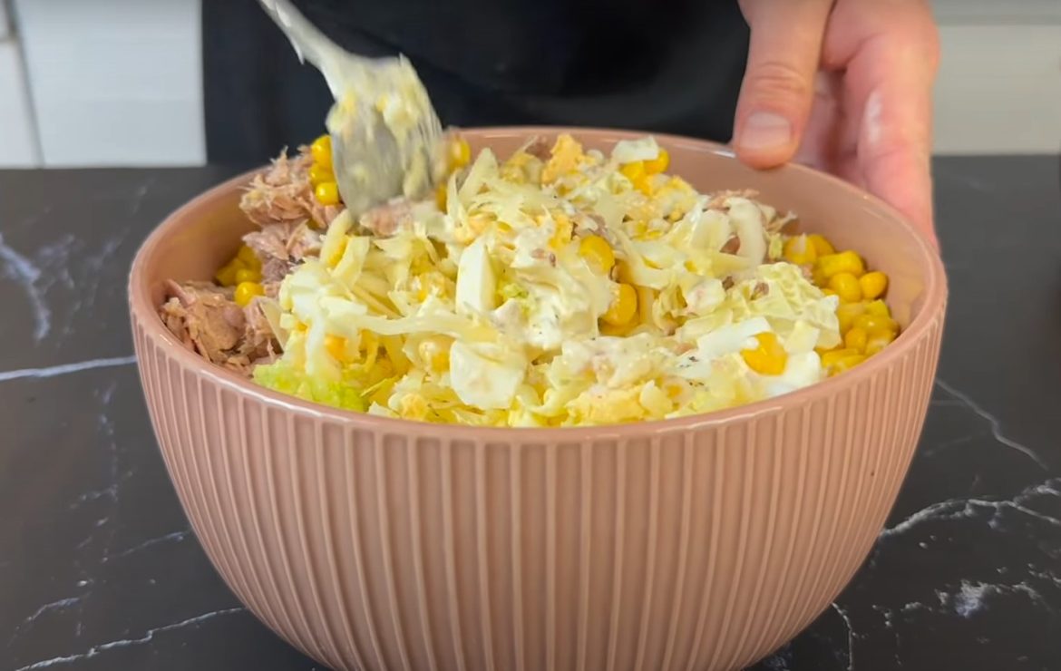 Į dubenį sudėkite visus ingredientus: kopūstus, sūrį, kiaušinius, kukurūzus bei tuną.