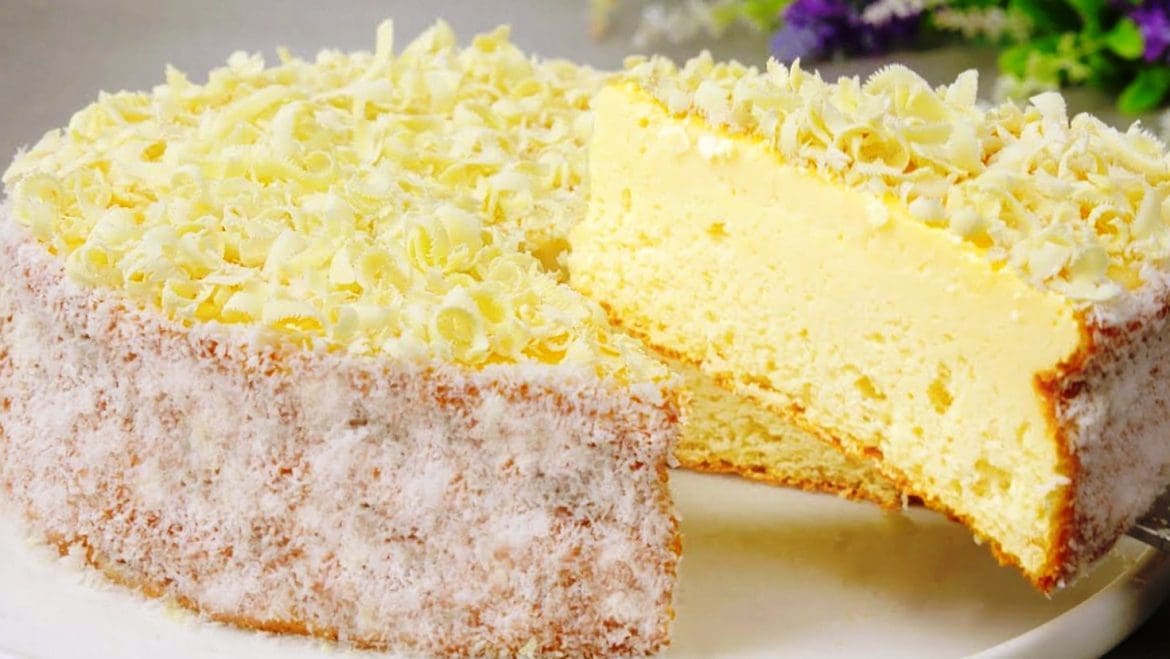 Biskvitą apibarstykite kokoso drožlėmis, o viršų papuoškite tarkuotu šokoladu.