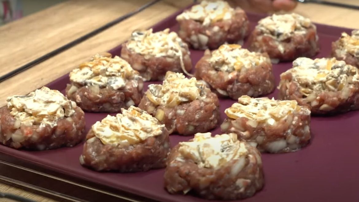 Iš maltos mėsos suformuokite nedidelius paplotėlius. Viduryje padarykite įdubą – tai būsimas „lizdelis“. Į šią įdubą dėkite grybų ir svogūnų įdarą.