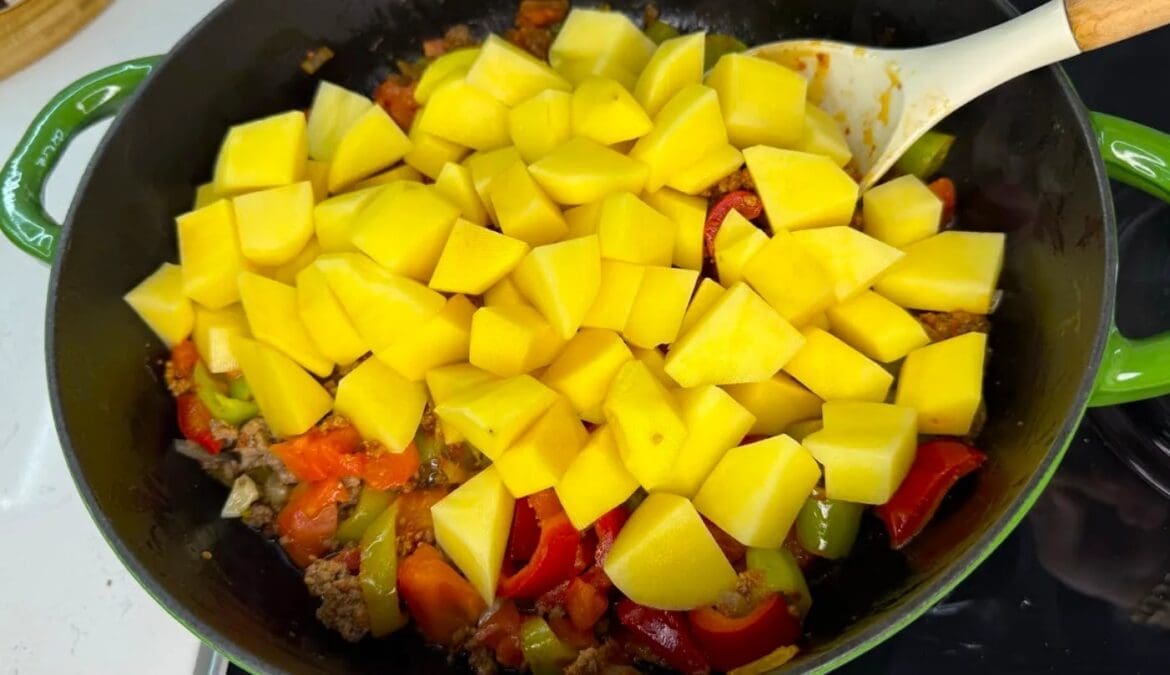 Kai daržovių ir mėsos pagrindas jau paruoštas, į keptuvę sudėkite bulves.