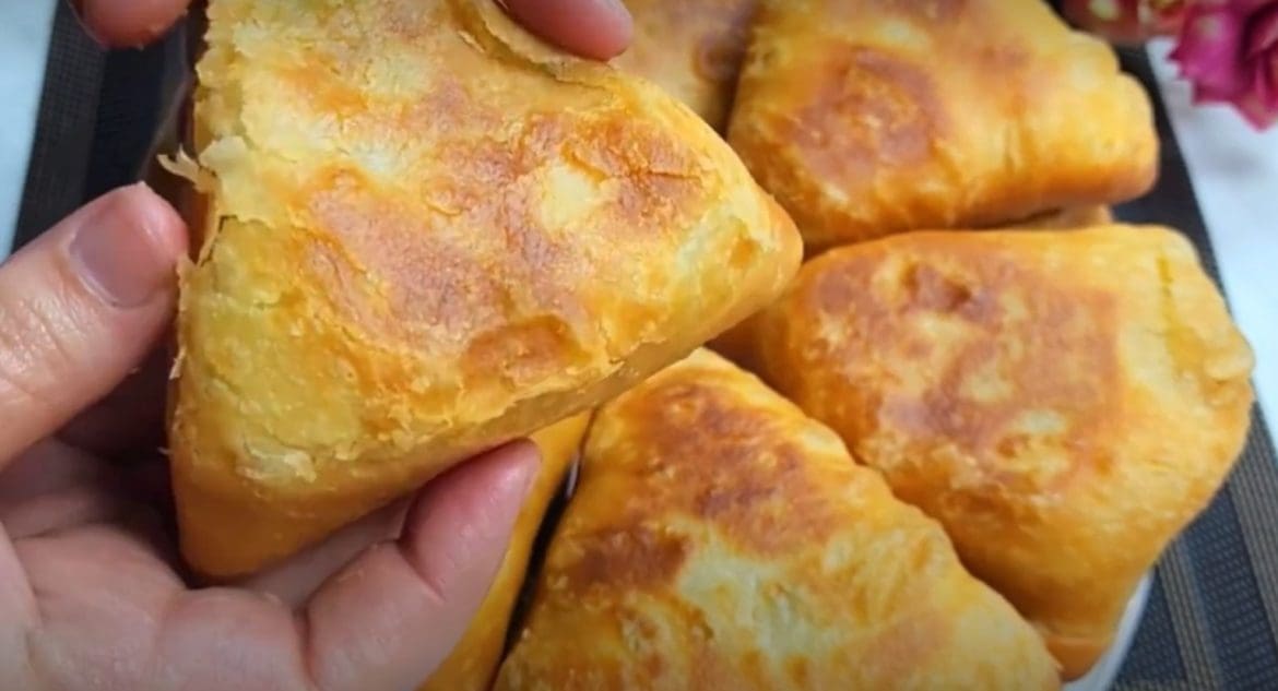 Tešlos kraštus suimkite į trikampį ir apverskite pyragėlius siūle žemyn. Keptuvėje įkaitinkite 100 ml augalinio aliejaus ir sudėkite į ją pyragėlius.