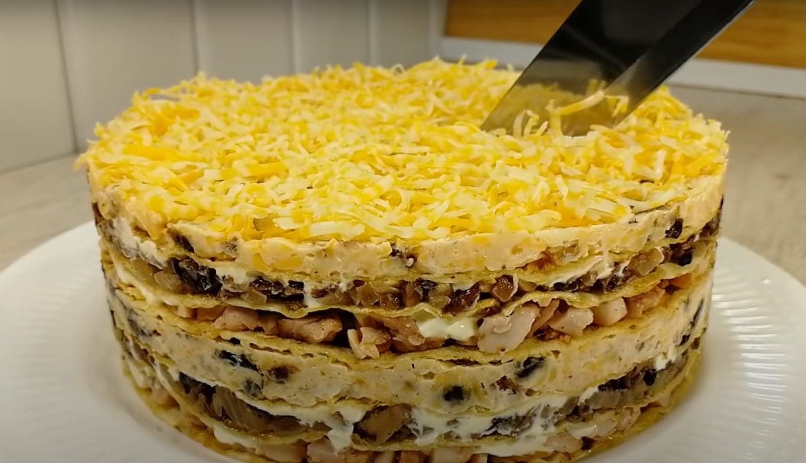 Dėl to užkandžių pyragas puikiai išlaiko formą ir be konditerinio žiedo. Šis pyragas nėra tipiškas kepenėlių pyragas, todėl šventės svečiams patiks.