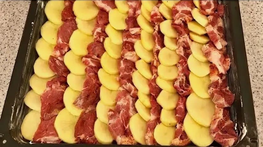 Kepimo skardos paruošimas: Imkite kepimo skardą ir sutepkite ją augaliniu aliejumi, kad patiekalas nepriliptų. Į skardą pirmiausia dėkite bulvių griežinėlius, tada ant jų dėkite mėsą, užpildydami tarpelius.