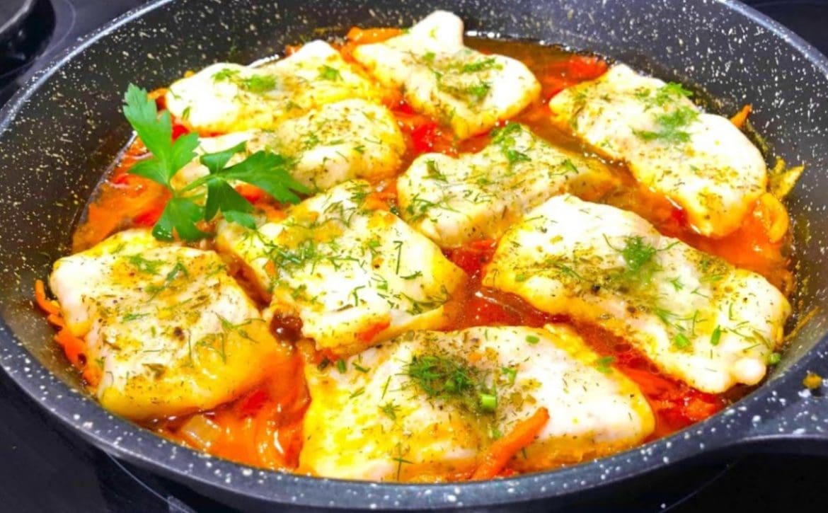 Ši troškinta žuvis puikiai tiks su ryžiais ar bulvėmis kaip garnyras. Patiekalas pasirodo aromatingas, švelnus ir sultingas.