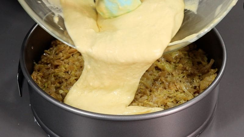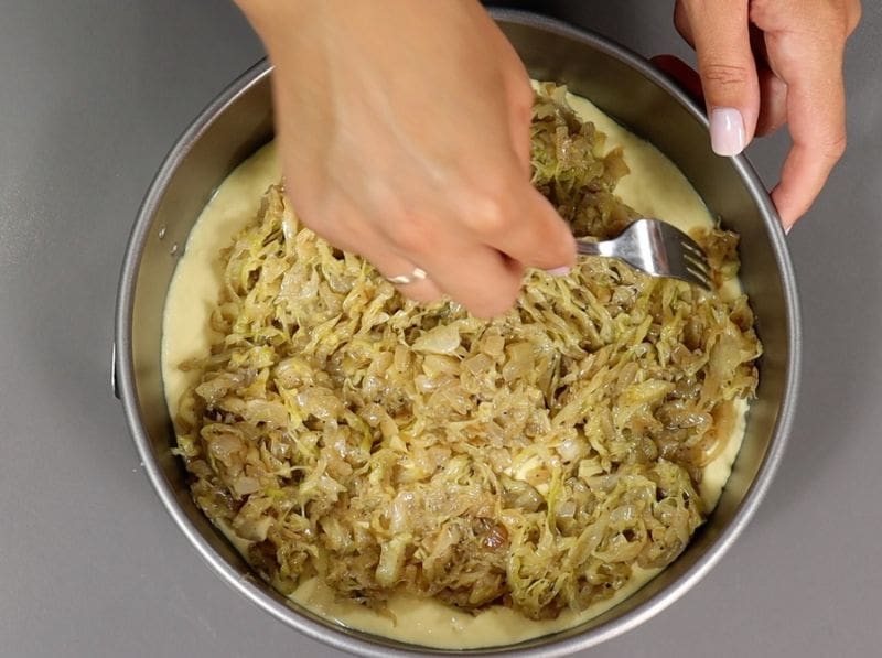 24 cm skersmens formos dugną išklokite kepimo popieriumi ir supilkite pusę tešlos. Mentele tolygiai paskirstykite ant keptuvės dugno ir paskleiskite kopūstų įdarą.
