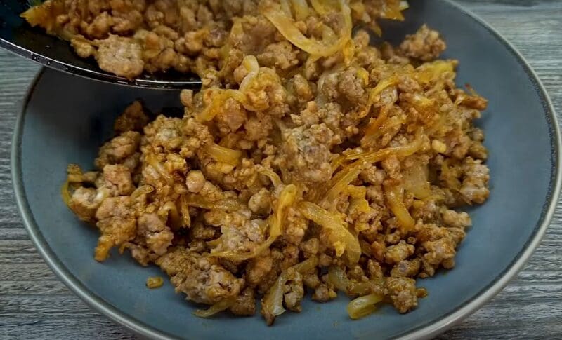 Maltą mėsą apkepkite keptuvėje aliejuje. Svogūną susmulkinkite ir suberkite į faršą, pakepinkite, kol svogūnas suminkštės.