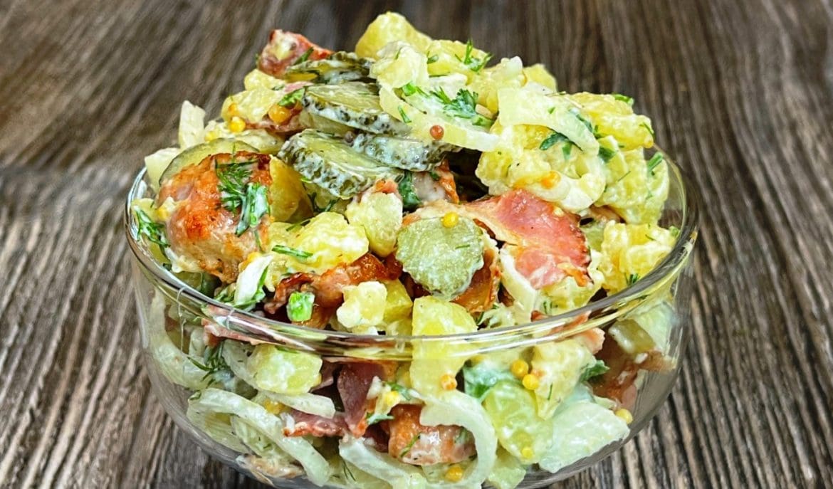 Šių salotų žavesys – kontrastai. Švelnios bulvės susilieja su traškia šonine, o agurkų rūgštelė balansuoja riebesnį padažą. Česnakas suteikia aromato, o krapai – lengvumo.