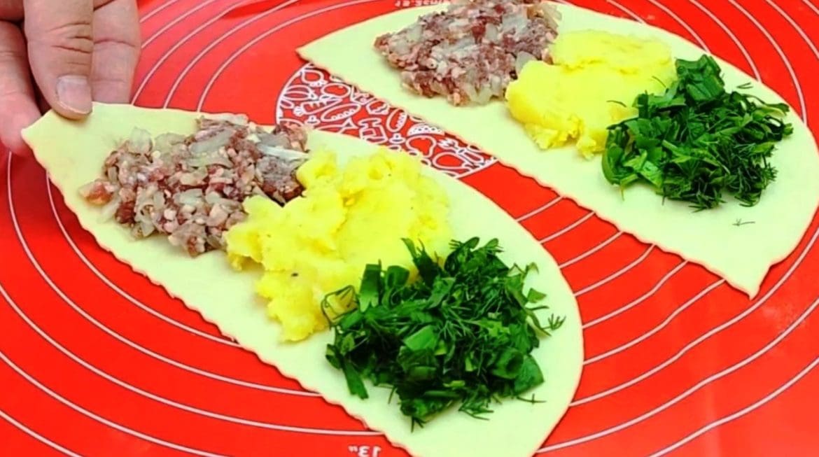 Iš kolobokų kočėlu iškočiokite į plonus 25-30 cm skersmens papločius padalykite į dvi dalis. Į kiekvieną dalį per visą paviršių paskirstome mėsos įdarą, tada – bulvių įdarą.