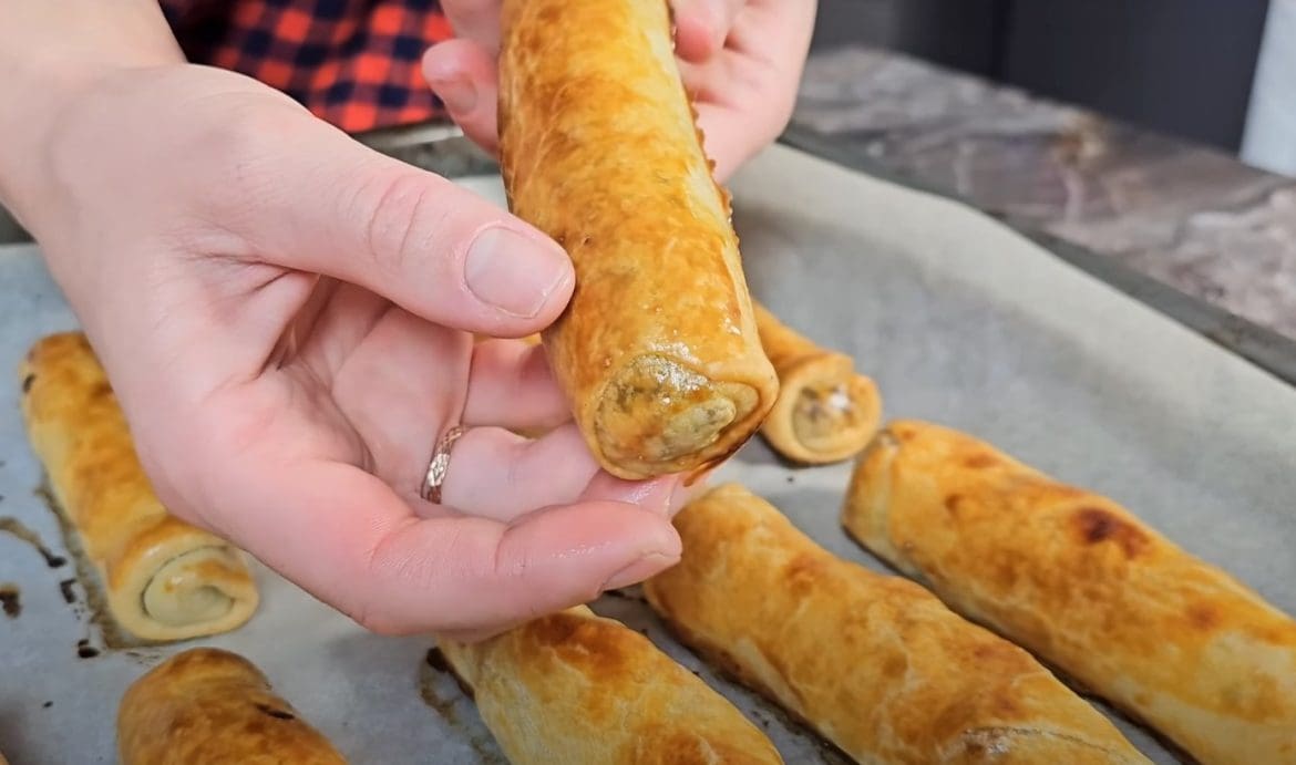 Tešlą padalinkite į 15–17 dalių. Kiekvieną iškočiokite į ploną paplotėlį. Į vieną kraštą dėkite įdaro, susukite į vamzdelį, užlenkite kraštus.
