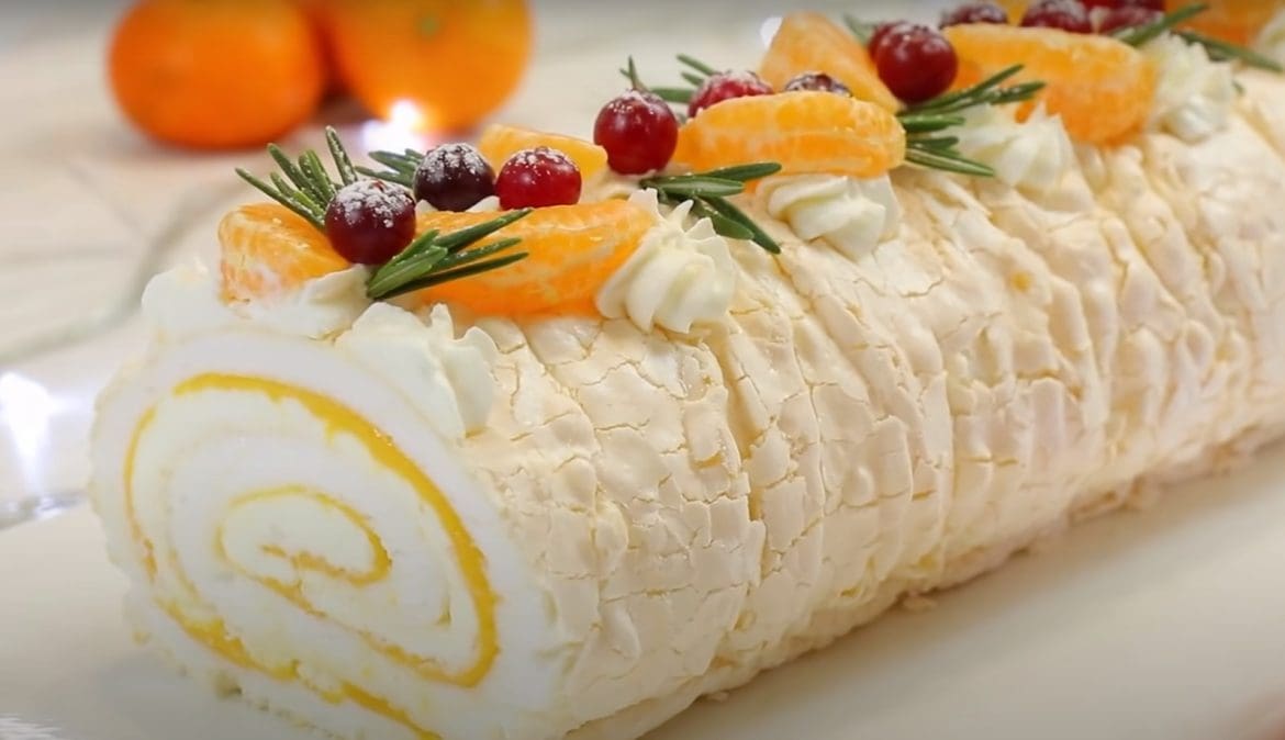 Morenginį vyniotinį galima papuošti likusiu kremu, mandarinais ir spanguolėmis. Tai labai gražus ir saldus desertas Naujųjų metų ir Kalėdų stalui.