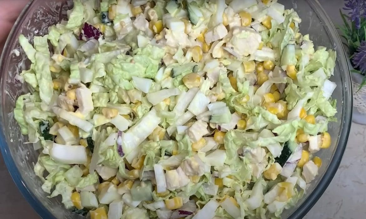 Į didelį dubenį sudėkite kopūstus, agurką, svogūną, kiaušinius, vištieną ir kukurūzus. Įberkite druskos, garstyčių, įdėkite šaukštą majonezo ar grietinės. Viską gerai išmaišykite.