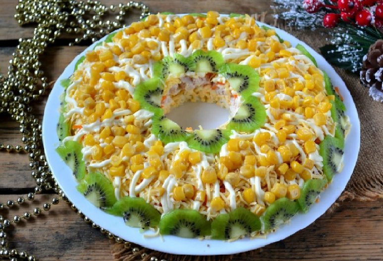 Užbaikite dekorą kukurūzų branduoliais, kad salotos atrodytų ryškios ir elegantiškos.