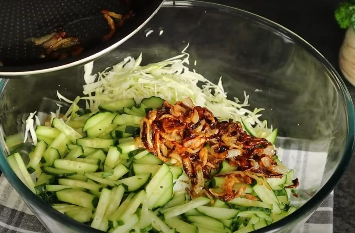 Sumaišymas: Į didelį dubenį sudėkite kopūstus, agurkus, kiaušinius ir keptus svogūnus. Pagardinkite grietine arba majonezu, įberkite druskos ir cukraus pagal skonį. Gerai išmaišykite, kad ingredientai tolygiai pasiskirstytų.