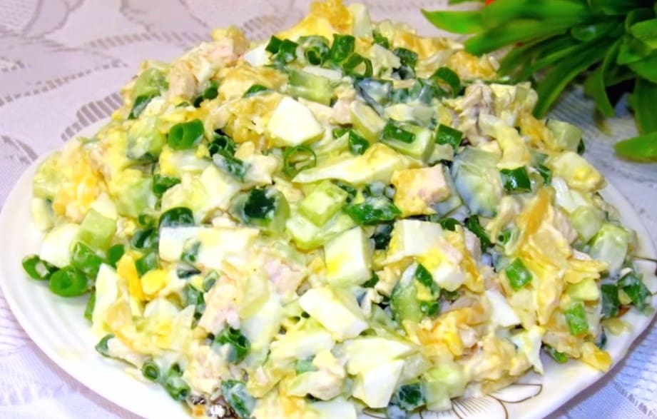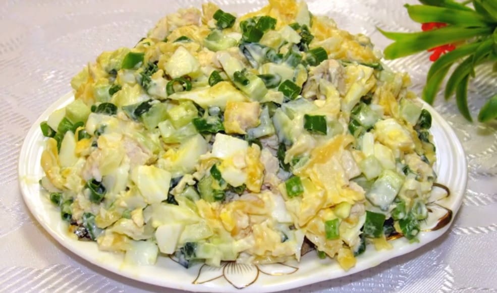 Dideliame dubenyje sumaišykite vištienos kubelius, kietai virtus kiaušinius, agurkus, marinuotus svogūnus, tarkuotą sūrį ir smulkiai pjaustytus žaliuosius svogūnus.