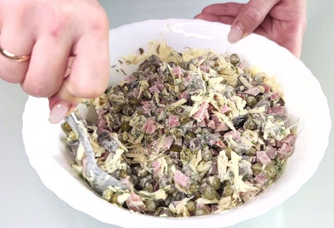 Galiausiai įdėkite paruoštus grybus ir viską pagardinkite majonezu. Majonezo kiekį reguliuokite pagal savo skonį – vieni mėgsta sausesnes salotas, kiti – kremines ir sodrias. Viską gerai išmaišykite, kad ingredientai tolygiai pasiskirstytų.