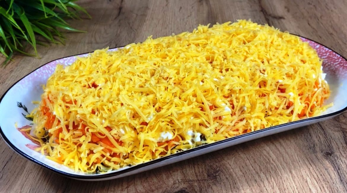 Ketvirtasis sluoksnis. Sutarkuokite sūrį ir pabarstykite viršų. Norint, salotas galima lengvai paspausti šakute, kad sluoksniai geriau susigulėtų.
