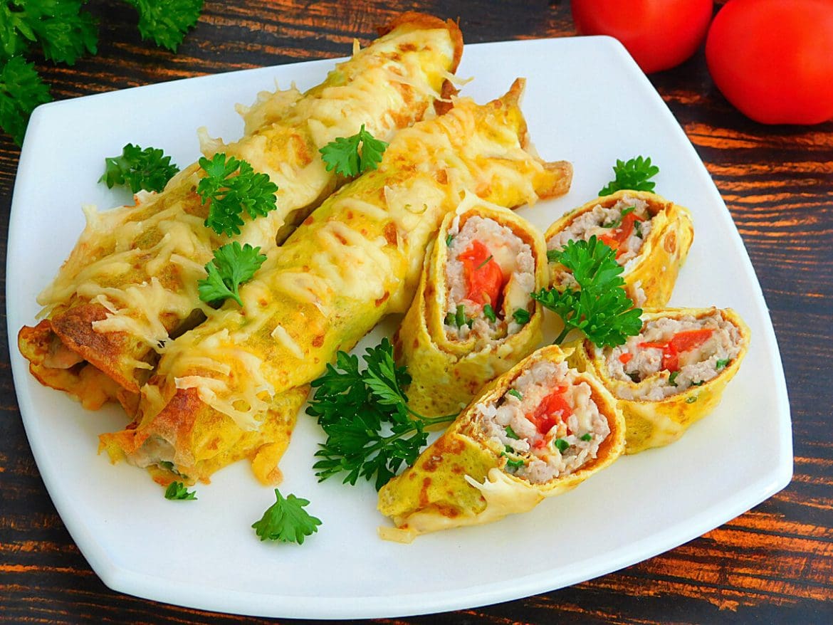 Brizolių formavimas: Paimkite vieną omleto blyną ir ant jo vidurio uždėkite ploną sluoksnį maltos mėsos mišinio, palikdami apie 2 cm nuo kraštų laisvus. Ant mėsos sluoksnio pabarstykite šiek tiek tarkuoto sūrio ir uždėkite kelias pomidoro juosteles. Atsargiai susukite blyną į ritinėlį, pradedant nuo vieno krašto ir užbaigiant priešingu, kad įdaras būtų sandariai uždarytas viduje. Pakartokite šį procesą su likusiais blynais ir įdaru.