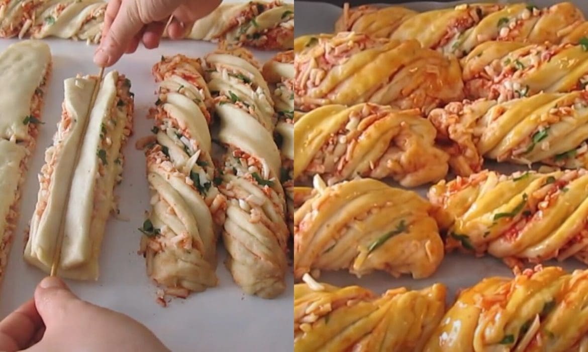 Naudodami peilį, nupjaukite tešlos kraštus, kad gautumėte gražias formas. Supjaustykite tešlą į vienodus stačiakampius, kad kiekviena pica būtų panašaus dydžio. Sutepkite viršų tirpintu sviestu, kad picų paviršius būtų auksinės spalvos.