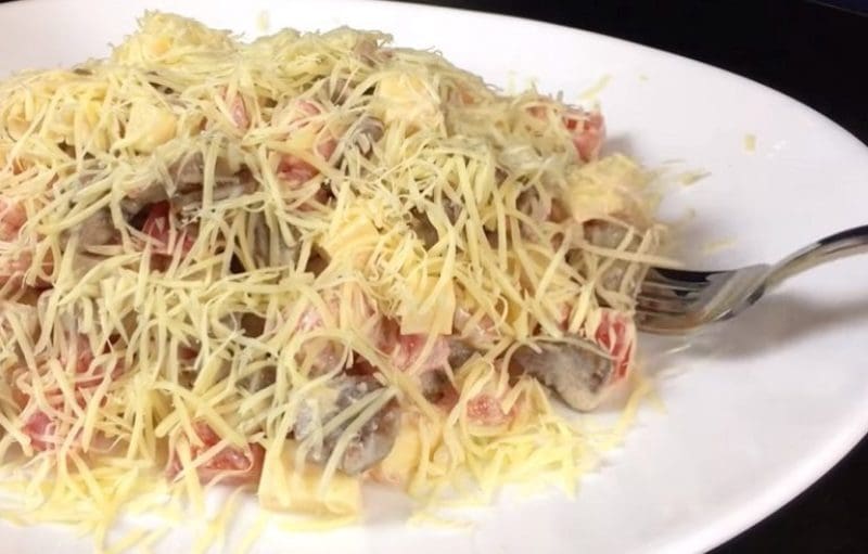 Pateikimas: Paruoštas salotas išdėliokite ant serviravimo indo. Ant viršaus pabarstykite smulkiai tarkuotu sūriu, kuris suteiks papildomo skonio ir tekstūros. Jūsų „Prancūziškas bučinys“ salotas paruoštos patiekti!