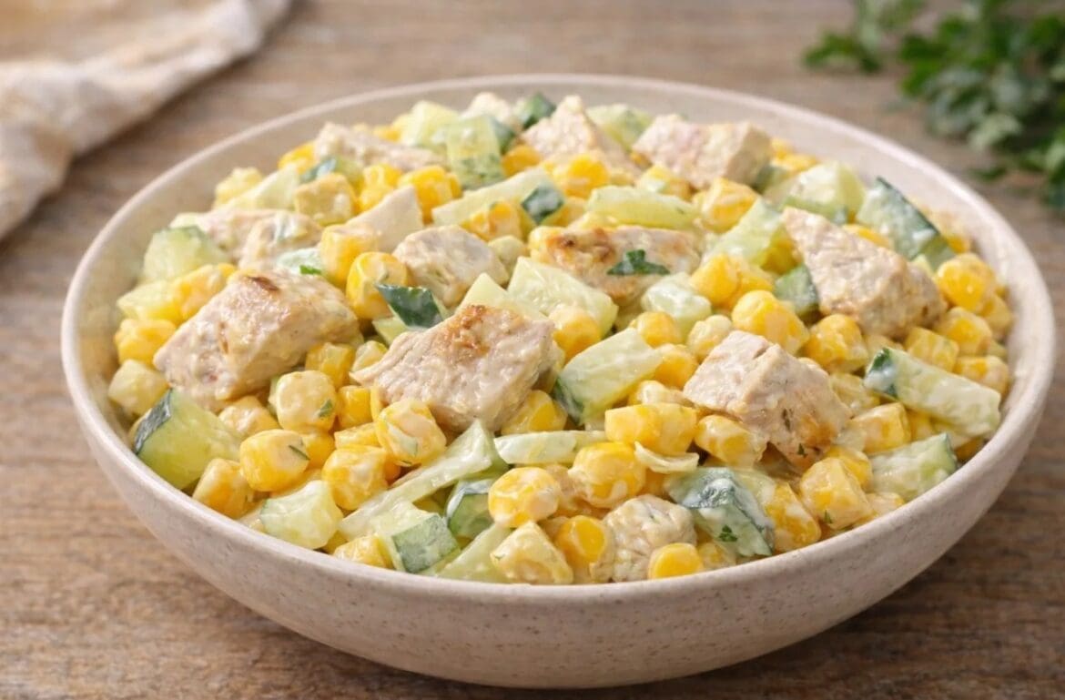 Šiame recepte sujungiami keli paprasti, tačiau puikiai derantys ingredientai: kepta vištiena, kiaušiniai, agurkai ir kukurūzai. Toks derinys suteikia salotoms švelnų skonį, malonią tekstūrą ir subtilų saldumą. Be to, šios salotos paruošiamos vos per kelias minutes, todėl jos idealiai tinka tuomet, kai neturite daug laiko, tačiau norite pagaminti kažką skanaus.
