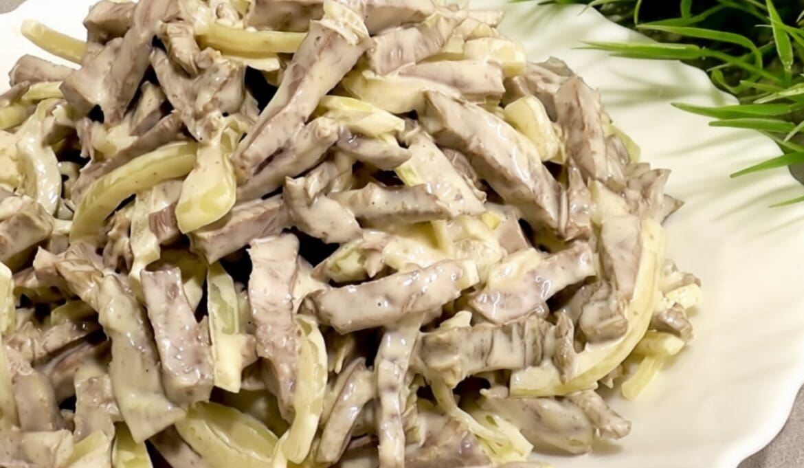 Atvėsus, širdį supjaustykite mažais gabalėliais. Sumaišykite su marinuotais svogūnais ir pagardinkite majonezu. Druskos kiekį galite reguliuoti pagal skonį. Geriausia salotas palaikyti šaldytuve bent kelias valandas, kad skoniai gerai susijungtų.