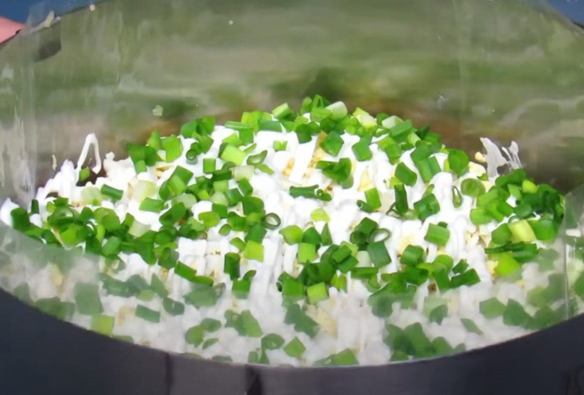 - Viršutinis sluoksnis – tarkuoti kietieji sūriai ir virtų kiaušinių gabaliukai. Ant jų vėl užtepkite majonezą tinkleliu ir papuoškite smulkintais žaliaisiais svogūnais.