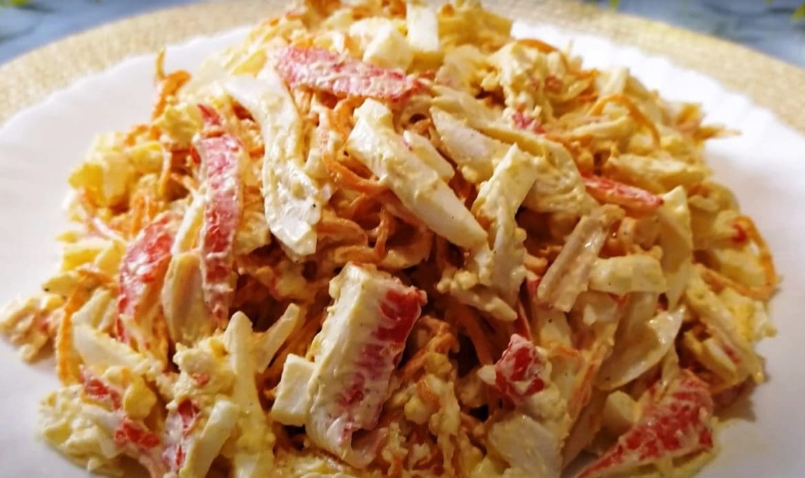 Klasikinės greito paruošimo salotos su krabų lazdelėmis