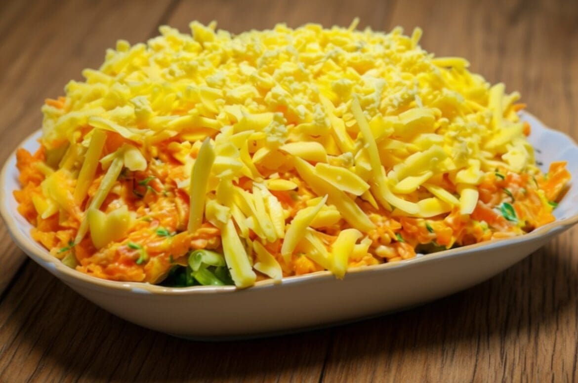 Morką nulupkite ir taip pat sutarkuokite stambia tarka. Sumaišykite ją su likusiu padažu ir paskleiskite ant agurkų sluoksnio. Šis sluoksnis suteiks salotoms lengvo saldumo ir papildomos tekstūros.