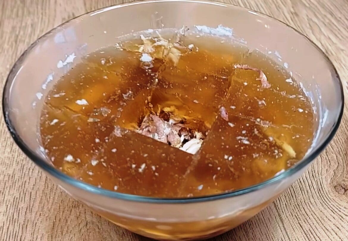 Drebučių surinkimas: Formą ar indą išklokite mėsos gabaliukais, ant jų užpilkite sultinį ir leiskite visiškai atvėsti ir sustingti. Jei norite, galite nugriebti riebalus viršuje, kai drebučiai sustings. Laikykitės šaldytuve apie 4 valandas arba per naktį, kad drebučiai įgautų norimą tekstūrą.