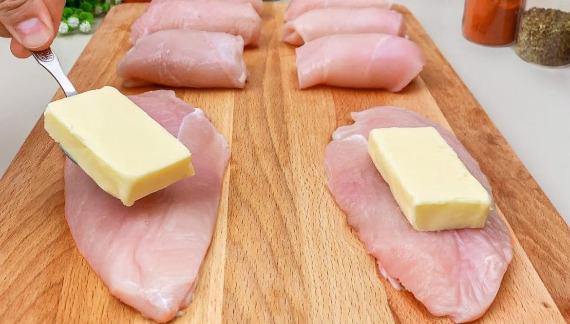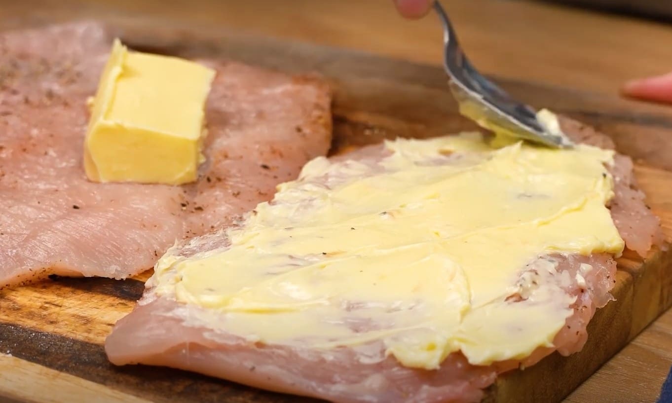 Vištienos krūtinėlę supjaustykite į 4 plokščias dalis. Uždenkite maistine plėvele ir išplakite. Druska ir pipirai pagal skonį. Kiekvieną gabalėlį sutepkite sviestu.