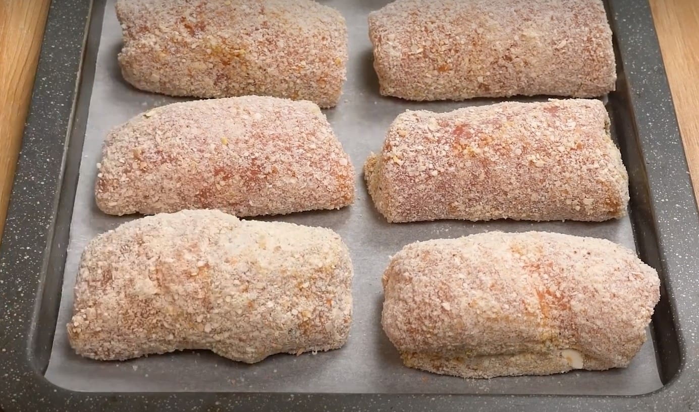 Ruošiame dvi lėkštes: su vištienos kiaušiniu ir su džiūvėsėliais. Sudrėkinkite ruošinius ir padėkite ant kepimo skardos, išklotos pergamentu.