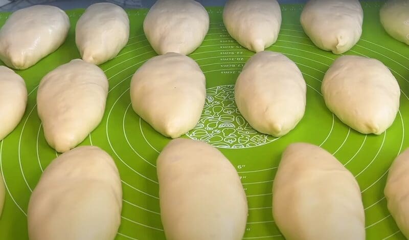 Išminkykite tešlą ir padalinkite į mažus rutuliukus. Iš rutuliukų rankomis formuojame nedidelius plokščius pyragėlius ir dedame į juos įdarą.