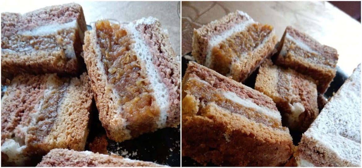 Baltąją tešlos dalį išimame iš šaldytuvo, iškočiojame ant miltais pabarstyto darbinio paviršiaus, dedame ant kepimo skardos, padengtos pergamentu, tada paskirstome obuolių masę, tolygiai paskirstome, tada atsargiai ir lengvai ištepame. baltymų masę, išlyginkite, tada iškočiokite rudą tešlą, sudėkite ant baltyminės masės, šakute pradurkite pyragą per visą paviršių.