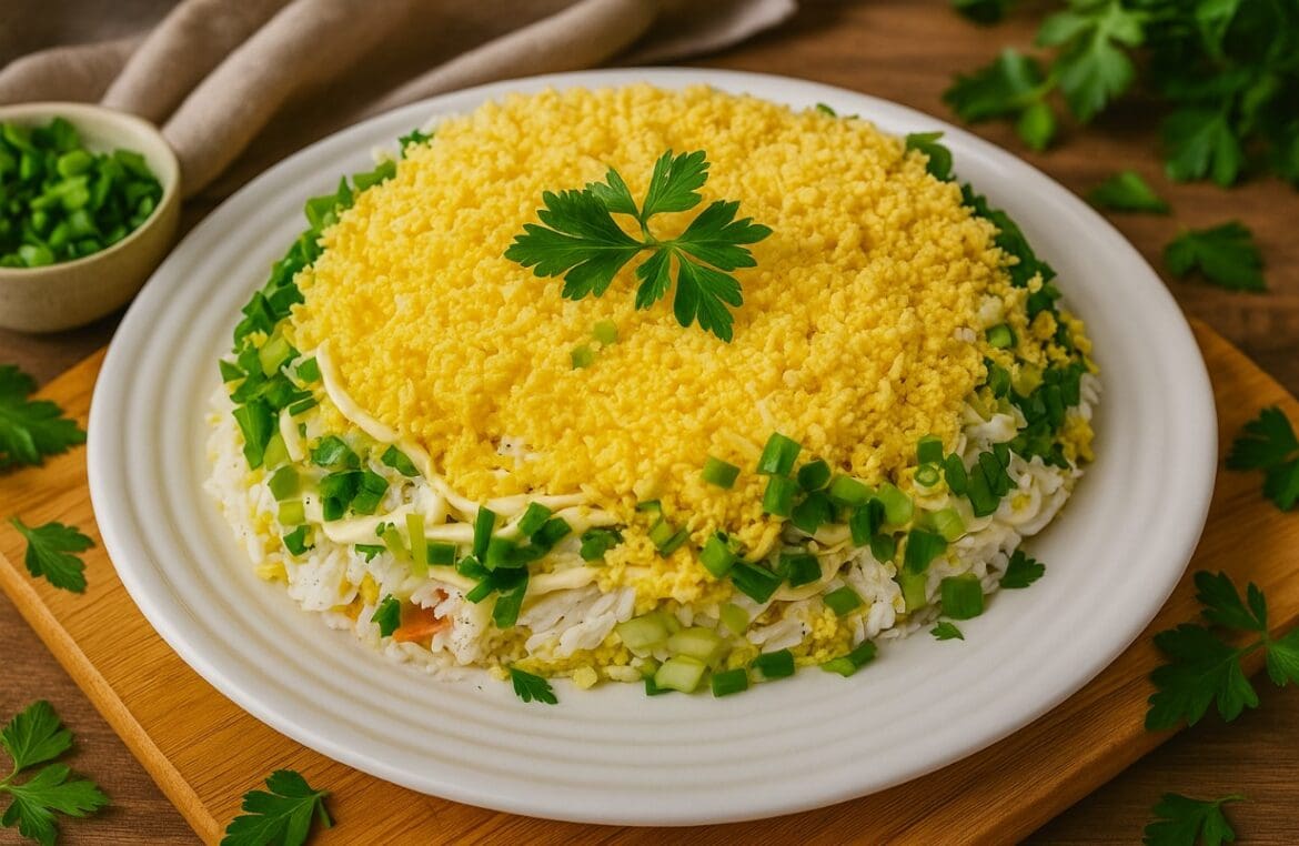 Paskutinis sluoksnis – smulkiai tarkuoti kiaušinių tryniai. Jie suteiks salotoms švelnią tekstūrą ir gražią spalvą.