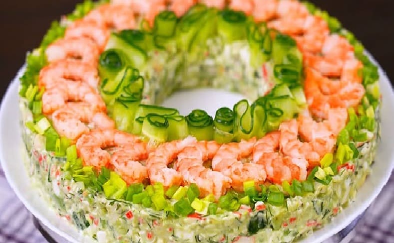 Kad pristatymas būtų dramatiškesnis, naudokite kepimo žiedą arba išdėliokite salotas vainiko pavidalu. Papuoškite likusiais agurkais, krevetėmis ir žolelėmis.
